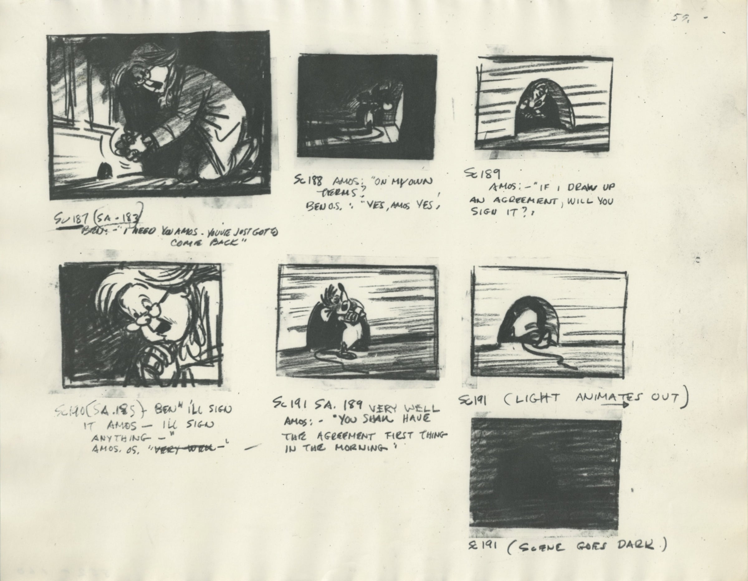 ABOUT THE MEDIUM: Storyboard Drawings show what’s moving in each shot, and in which direction, so that the production team is crystal clear on the desired end result. Photostat Storyboard Sheets are printed copies of the original storyboard drawings that were used by staff during the production of a film.