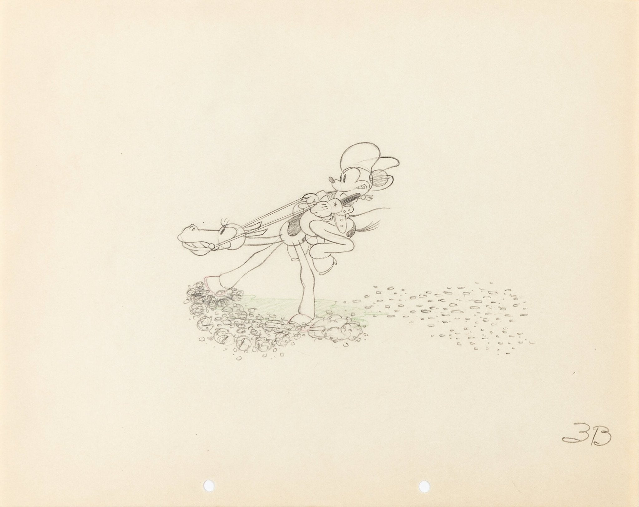 ABOUT THE IMAGE: Long considered to be one of Mickey's greatest shorts, Two-Gun Mickey sent Mickey, Minnie, and Peg Leg Pete back to the wild west! Pete chases after cowgirl Minnie, but Mickey doesn't let him get to her without a fight. The mouse and his faithful steed are the focus of this rare 12 field 2-peghole animation drawing from the Ben Sharpsteen-directed short. A few of Disney's "Nine Old Men" and other recognizable names at the studio contributed to the animation of the short, including Art Babbitt, Les Clark, Ollie Johnston, Eric Larson, Hamilton Luske, Fred Moore, and Wolfgang Reitherman. Mickey and his horse appear starting at about 5:54 as the horse charges down a steep cliff to get to Pete, the full figure pose dynamic, detailed, and action-packed on the page. The graphite with color pencil figures, marked 3B in the lower right, measures about 6.75'' x 4'' and is a testament to the magic and appeal of Mickey Mouse.