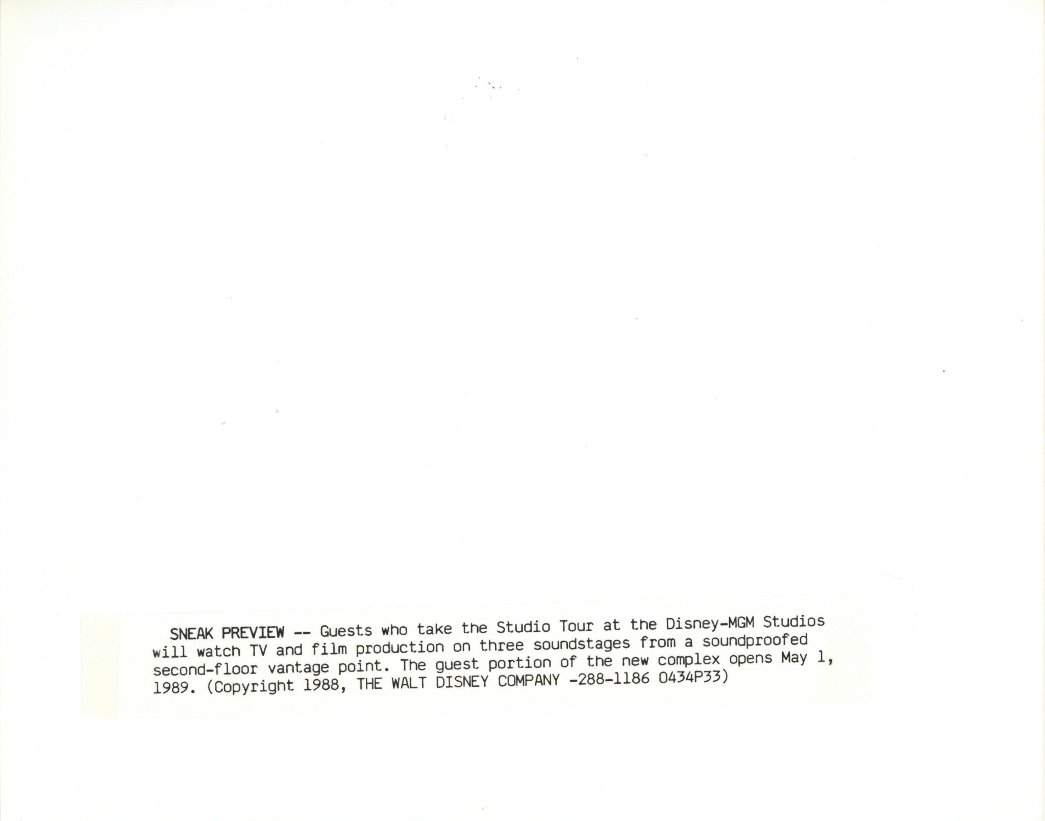 ABOUT THE IMAGE: "SNEAK PREVIEW -- Guests who take the Studio Tour at the Disney-MGM Studios will watch TV and film production on three soundstages from a soundproofed second-floor vantage point. The guest portion of the new complex opens May 1, 1989."