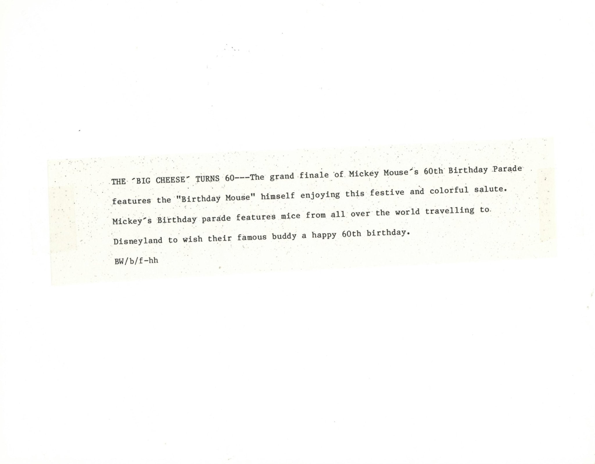 ABOUT THE IMAGE: "THE 'BIG CHEESE TURNS 60---The grand finale of Mickey Mouse's 60th Birthday Parade features the "Birthday Mouse" himself enjoying this festive and colorful salute. Mickey's Birthday parade features mice from all over the world traveling to. Disneyland to wish their famous buddy a happy 60th birthday."