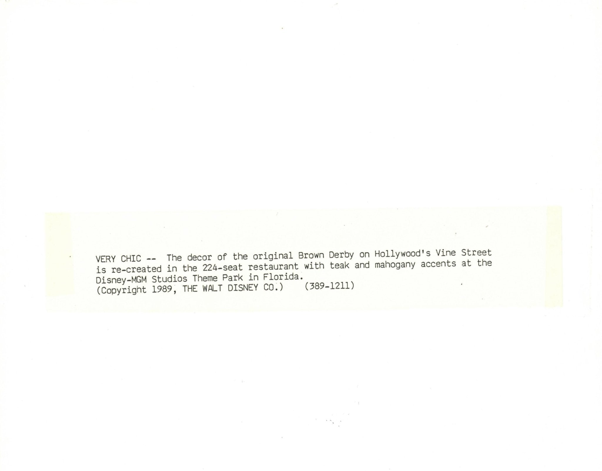 ABOUT THE IMAGE: "VERY CHIC -- The decor of the original Brown Derby on Hollywood's Vine Street is re-created in the 224-seat restaurant with teak and mahogany accents at the Disney-MGM Studios Theme Park in Florida."