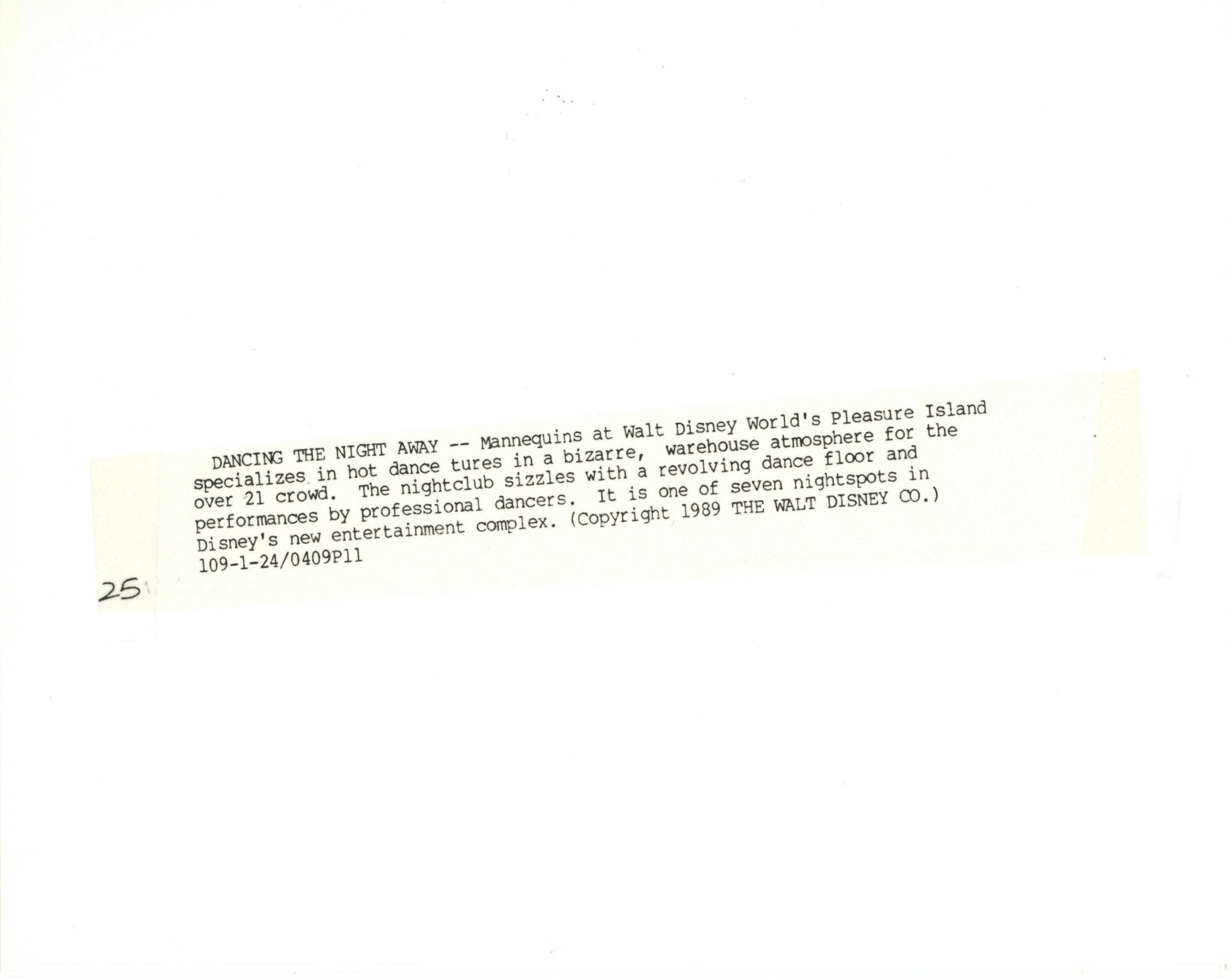 ABOUT THE IMAGE: "DANCING THE NIGHT AWAY -- Manneguins at Walt Disney World's Pleasure Island specializes, in hot dance tures in a bizarre, warehouse atmosphere for the over 21 crowd. The nightclub sizzles with a revolving dance floor and performances by professional dancers. It is one of seven nightspots in Disney's new entertainment complex."