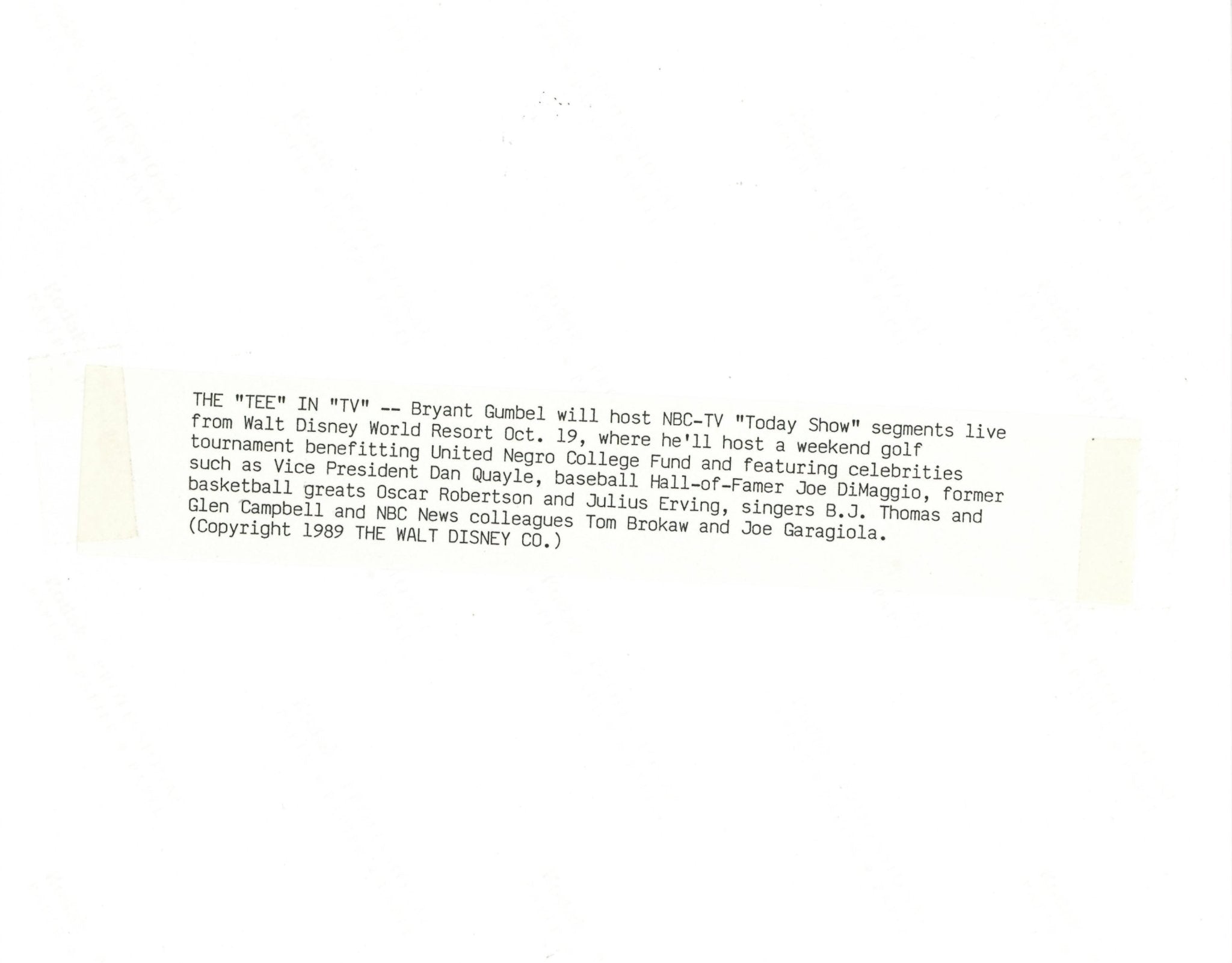 THE "TEE" IN "TV" -- Bryant Gumbel will host NBC-TV "Today Show" segments live from Walt Disney World Resort Oct. 19, where he'll host a weekend golf tournament benefitting United Negro College Fund and featuring celebrities such as Vice President Dan Quayle, baseball Hall-of-Famer Joe DiMaggio, former basketball greats Oscar Robertson and Julius Erving, singers B.J. Thomas and Glen Campbell and NBC News colleagues Tom Brokaw and Joe Garagiola."