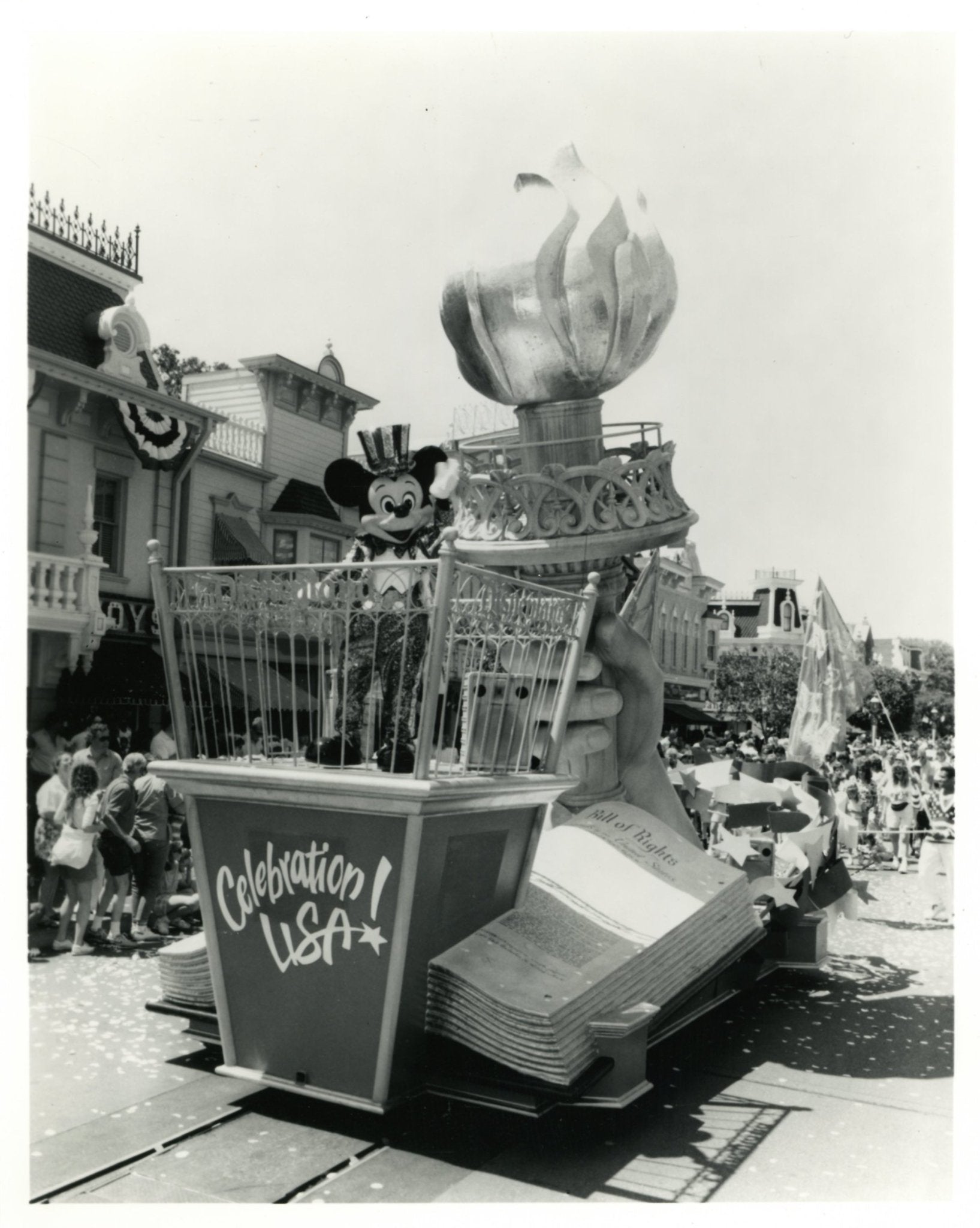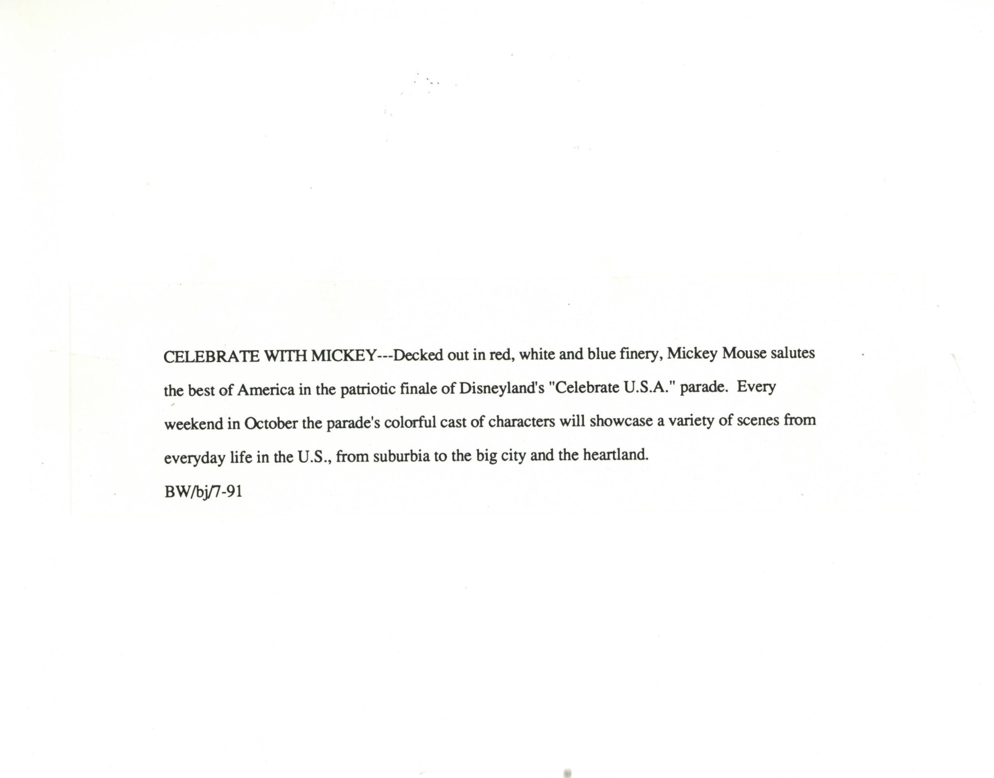 ABOUT THE IMAGE: "CELEBRATE WITH MICKEY --Decked out in red, white and blue finery, Mickey Mouse salutes the best of America in the patriotic finale of Disneyland's "Celebrate U.S.A." parade. Every weekend in October the parade's colorful cast of characters will showcase a variety of scenes from everyday life in the U.S., from suburbia to the big city and the heartland."