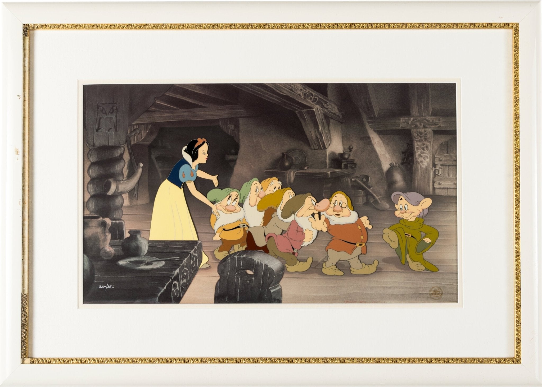 Fully hand-painted and laboriously hand-inked, the eight characters share a combined image area of 15" x 7," absolutely spanning the frame which captures all seven of the beloved Dwarfs (Bashful, Sleepy, Happy, Sneezy, Grumpy, Doc, and Dopey) as Snow sends them off to bed. The piece is paired with a faithfully recreated print background, prepared by Disney studio artists for display purposes. It has been matted to an overall size of 26" x 18" with an aperture of 19.25" x 11.25."