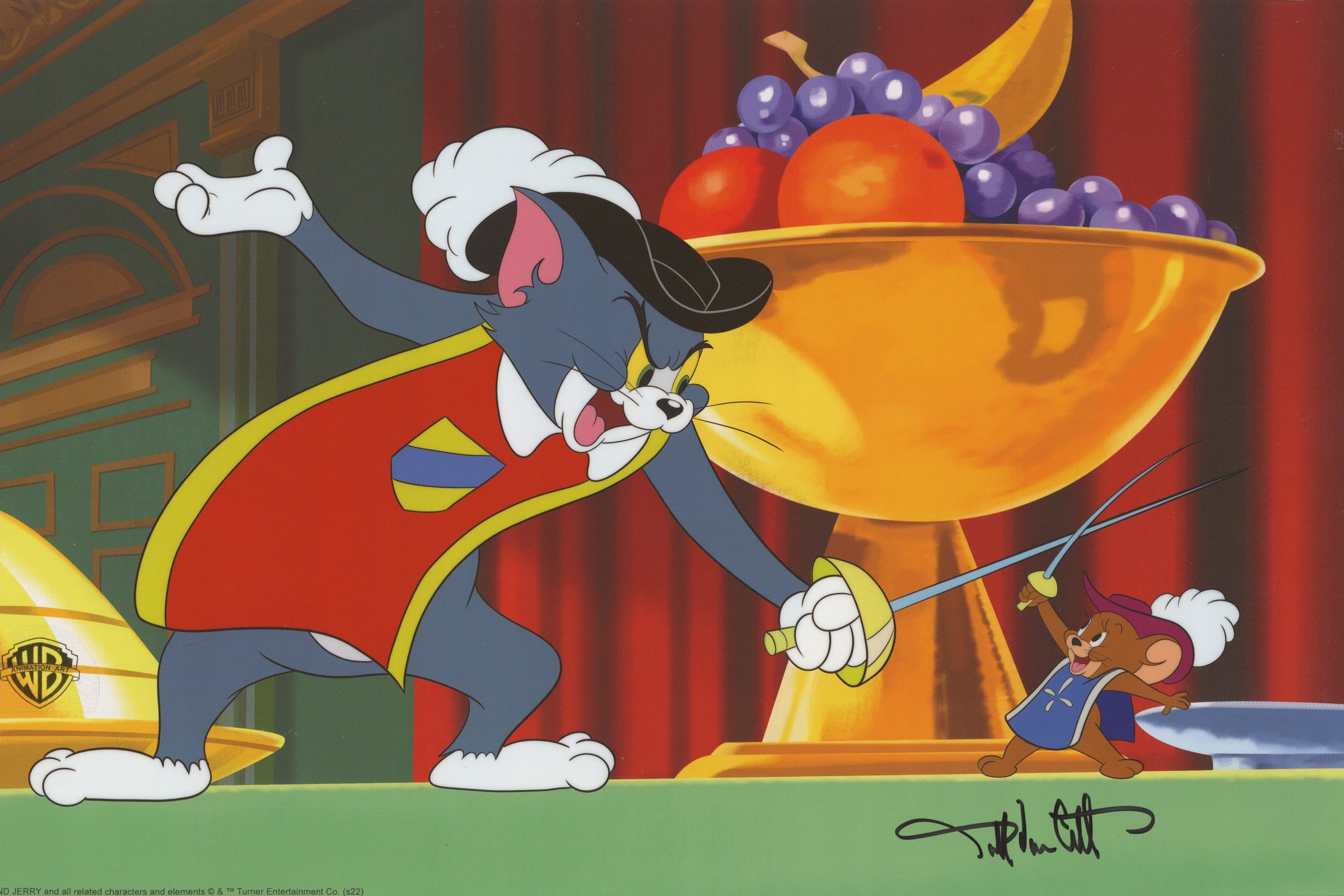 ABOUT THE IMAGE: This serigraph cel was created from a classic scene from the 1952 Tom and Jerry cartoon, “Two Mouseketeers,” directed by William Hanna and Joseph Barbera. Starring Tom and Jerry, the comedy features the legendary rivalry between the cat-and-mouse duo swashbuckling on the French king’s banquet table, in a spoof of Alexandre Dumas’ 1844 novel The Three Musketeers.