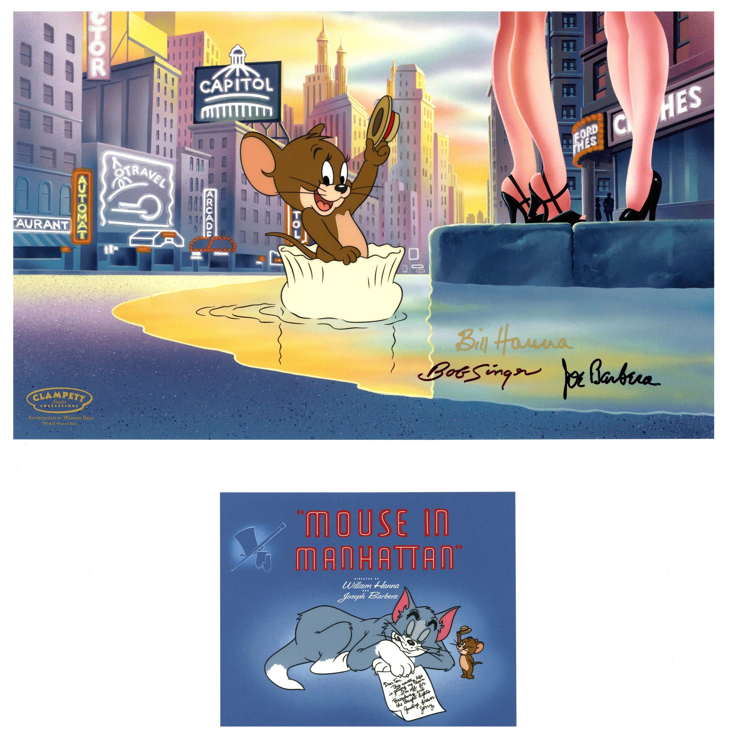 Originally drawn by Vince Mussachia and inked by Laurie Dindis, “Mouse in Manhattan” was then silk-screened onto acetate with the Clampett seal of authenticity. Each cel was then hand painted, while the background by Hector Martinez, was reproduced using the fine art Giclee method. Each piece is signed by Joe Barbera. Bill Hanna, who passed away in 2001, is paid tribute with his signature silkscreened in gold on the cel.
