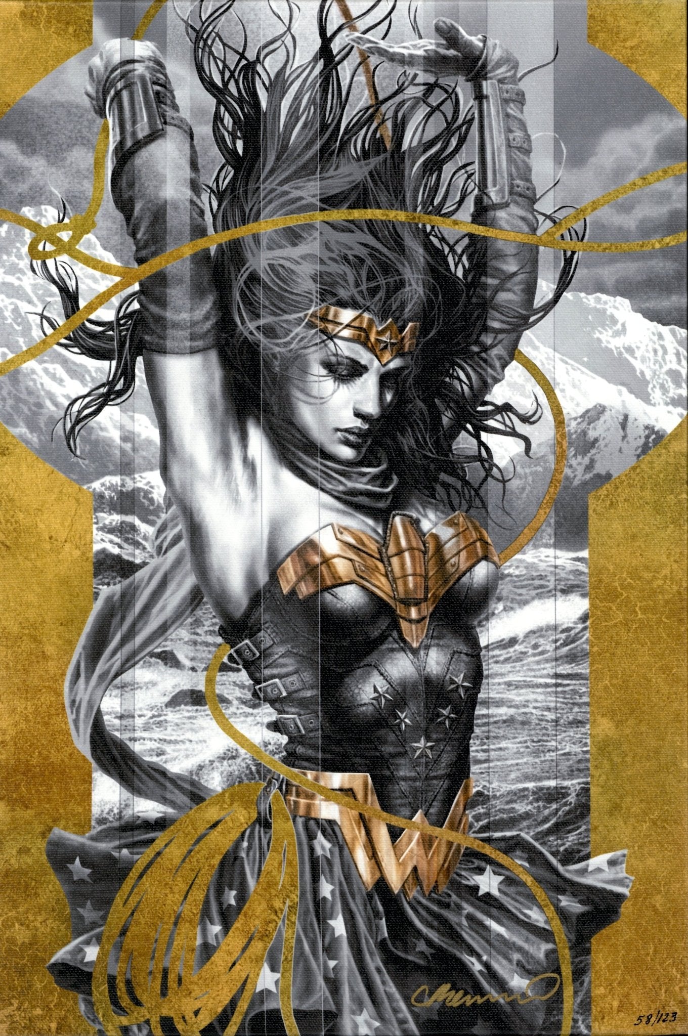 DESCRIPTION: This image was used for the cover of "Wonder Woman Black and Gold #6." Each piece is hand-numbered, signed, and remarqued by Lee Bermejo.