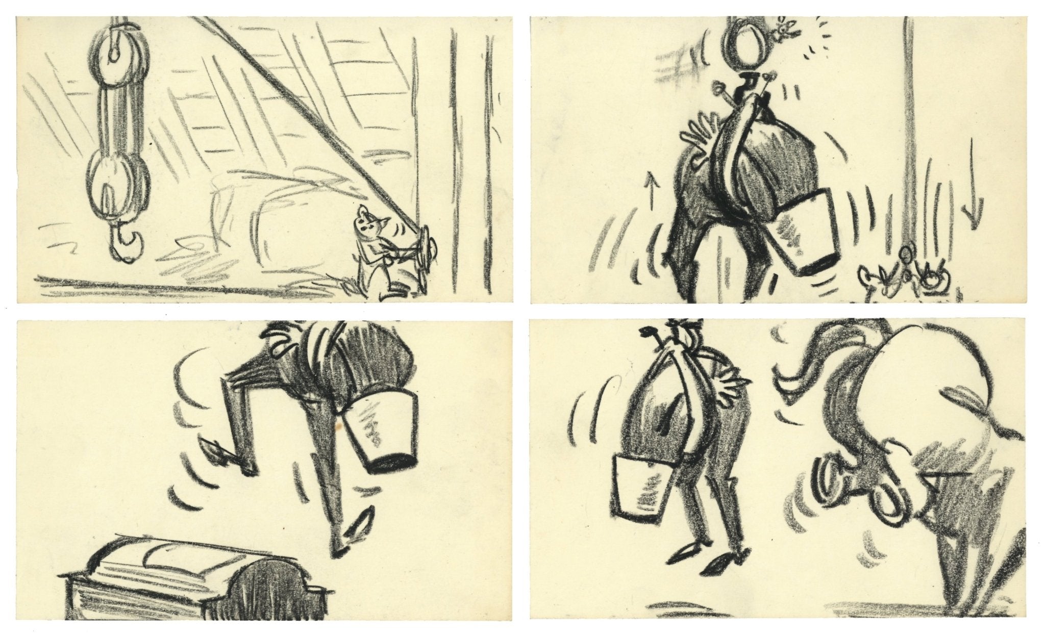 ABOUT THE IMAGE: These storyboards showcase the creativity involved in the making of The Aristocats. They were created for climactic sequence starting at about 1:12:52 when Edgar locks Duchess and her kittens in a trunk, ready to ship them off for good. O'Malley, Roquefort, Frau, and even Scat Cat and the Alley Cats help to stop him and make sure he's the one who is sent to Timbuktu. The artist of these storyboards is thought to be Vance Gerry (1929 - 2005), a storyboard, layout, and character artist at Disney for nearly 50 years.