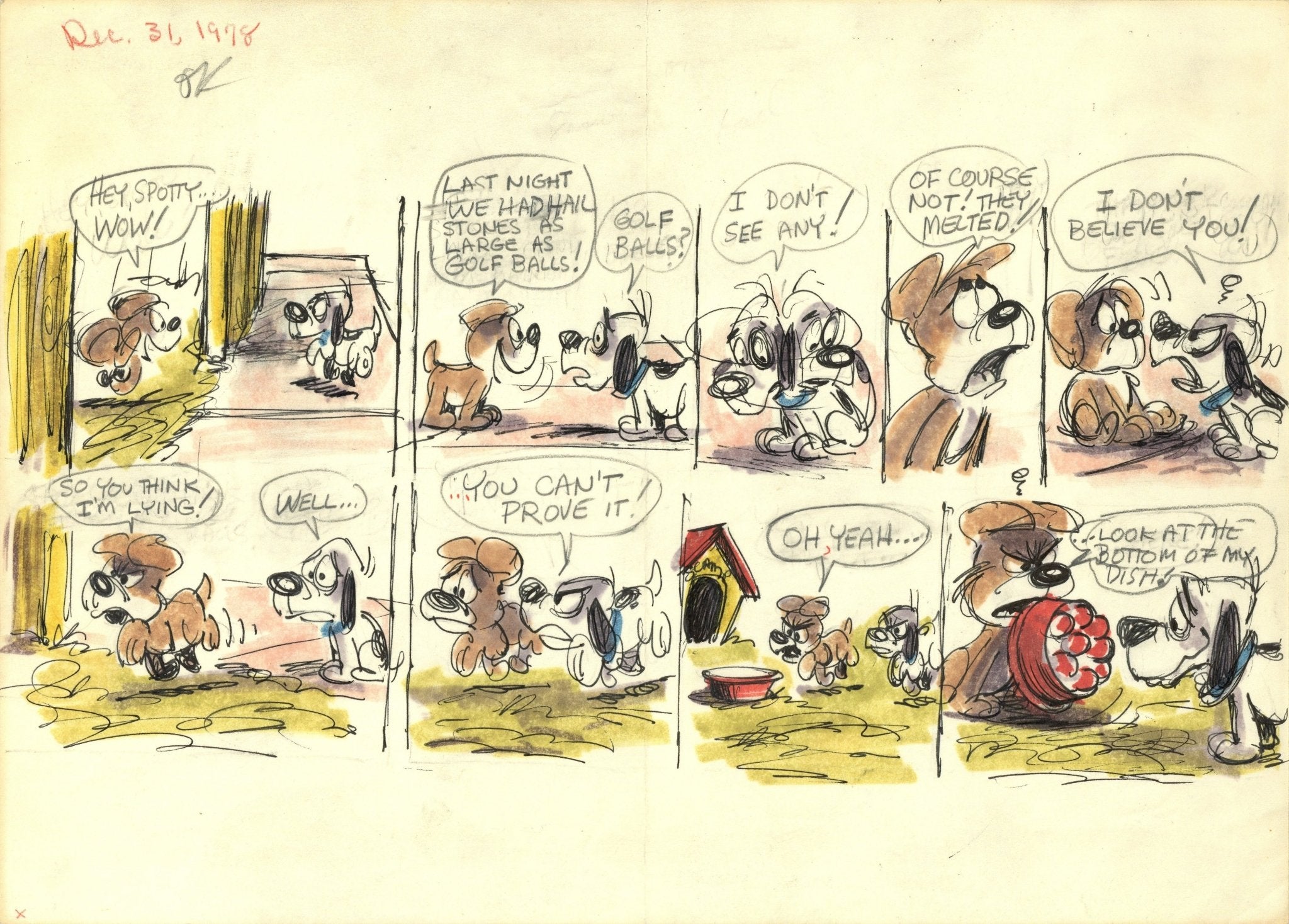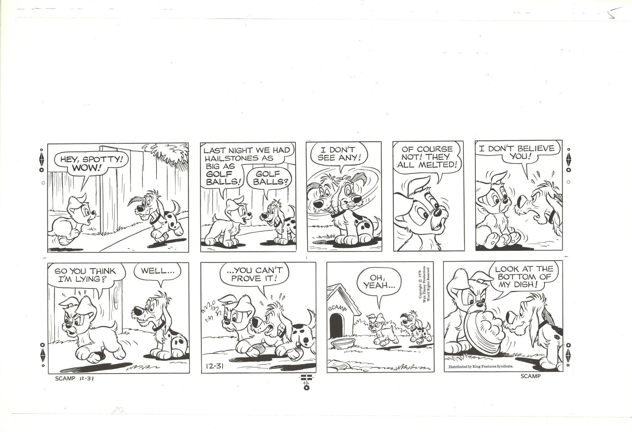 ABOUT THE IMAGE: This is artist-writer Bill Berg's lively original drawing for the Sunday comics episode published December 31st, 1978 with a copy of the black and white printed proof of the final version issued by King Features Syndicate to subscribing newspapers. In this episode, Scamp has an encounter with his pal Spotty. "Dec. 31, 1978" and editor's "OK" are written in red and black pencil in the top margin at left.