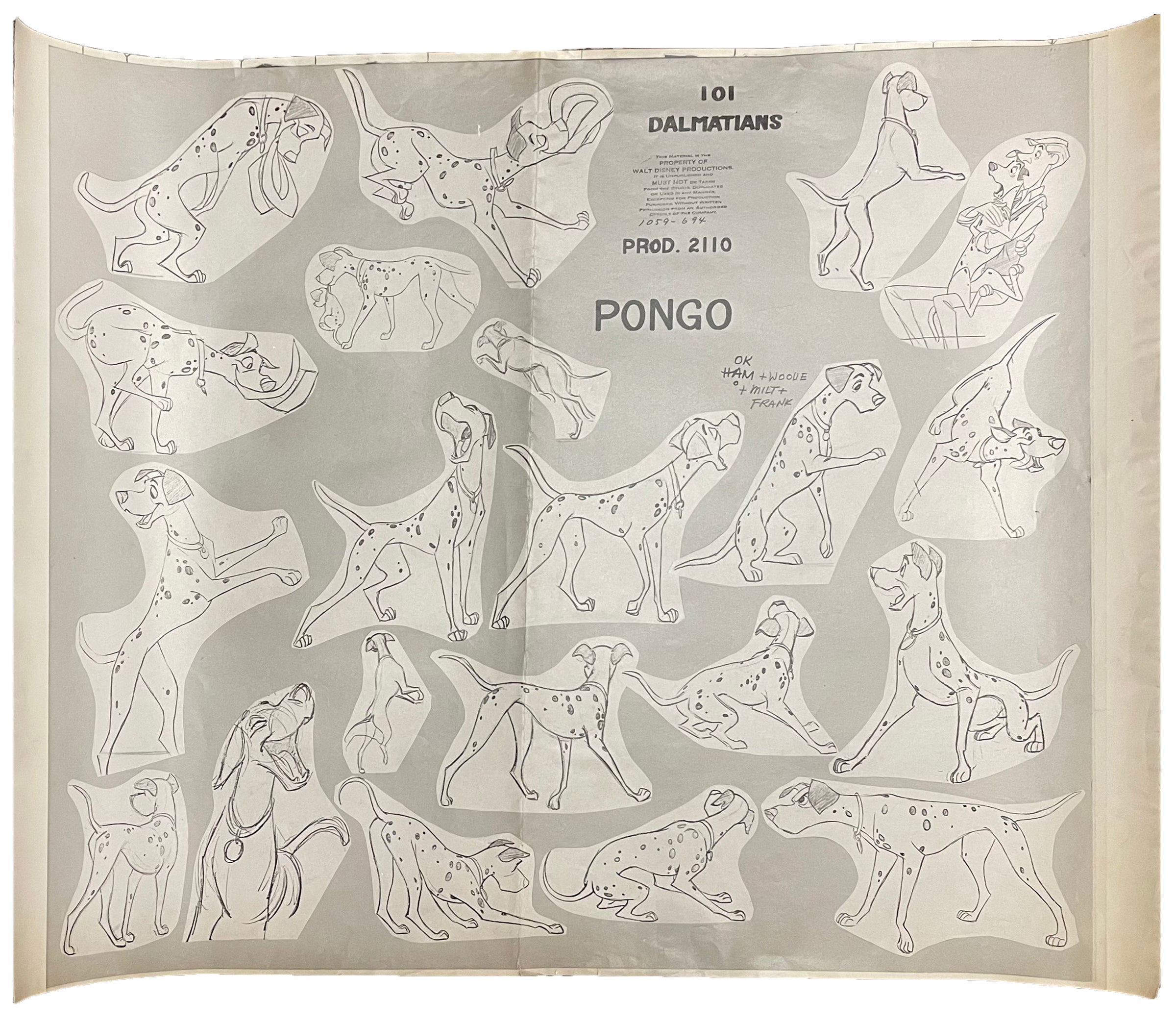 NOTES: "OK Ham + Woolie + Milt + Frank," (written by Hamilton Luske, Wolfgang Reitherman, Milt Kahl, and Frank Thomas) has been reproduced near the center of this model sheet. This piece shows signs of moderate production wear: center crease and edge wrinkling. Due to its size, this piece will be shipped rolled in a tube