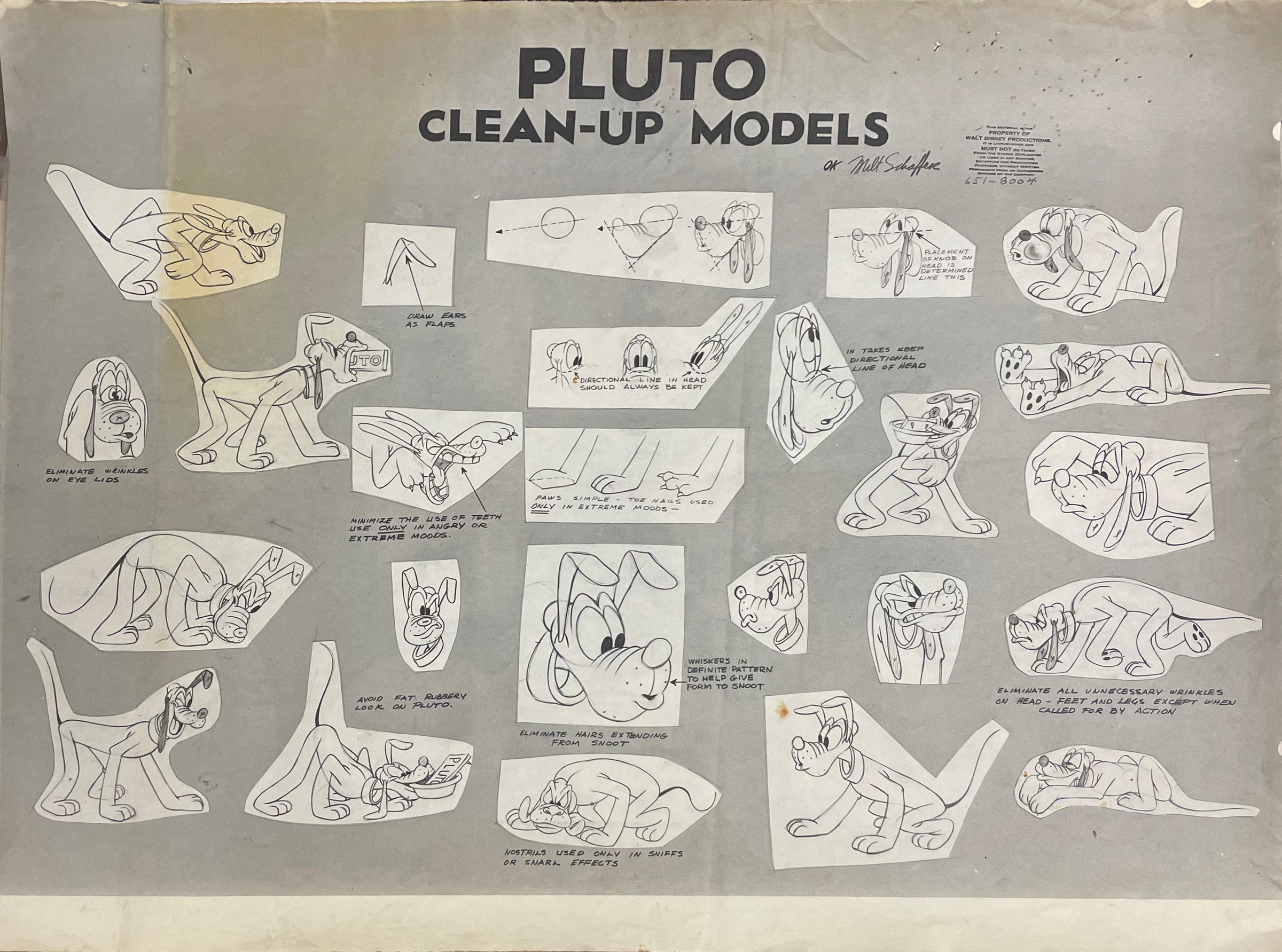 NOTES: "OK Milt Schaffer" (written by the director of the film) has been reproduced below the title of the model sheet. This piece shows signs of moderate production wear: creases, wrinkling on all margins, and pinhole marks. Due to its size, this piece will be shipped rolled in a tube.