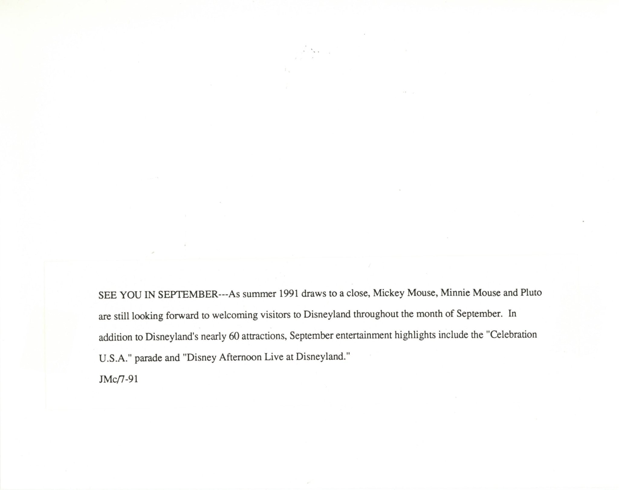 ABOUT THE IMAGE: "SEE YOU IN SEPTEMBER---As summer 1991 draws to a close, Mickey Mouse, Minnie Mouse and Pluto are still looking forward to welcoming visitors to Disneyland throughout the month of September. In addition to Disneyland's nearly 60 attractions, September entertainment highlights include the "Celebration U.S.A." parade and "Disney Afternoon Live at Disneyland."