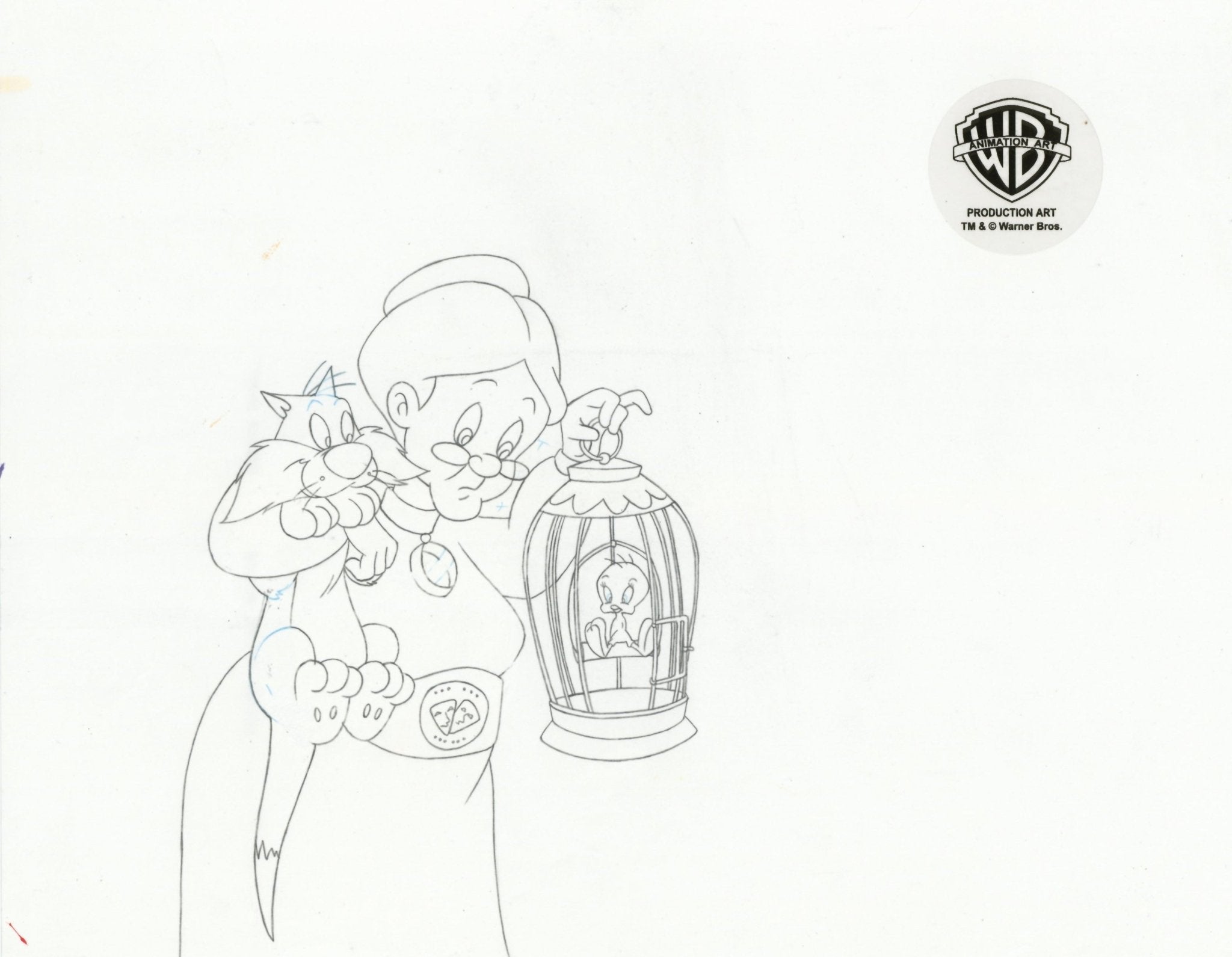 Sylvester and Tweety Mysteries Original Production Drawing: Granny, Sylvester, Tweety