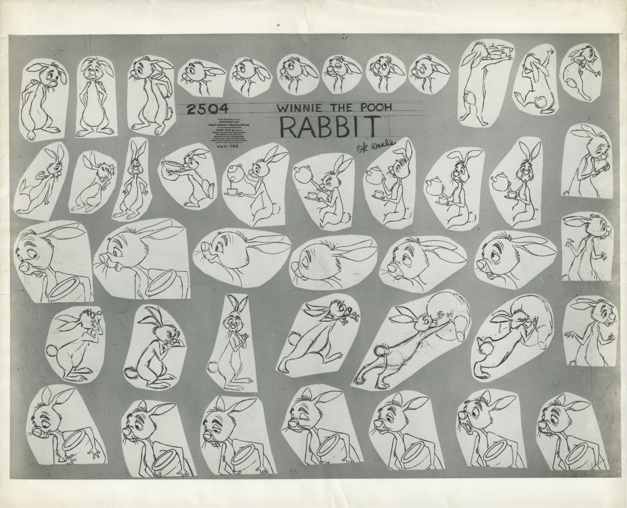 ABOUT THE MEDIUM: Photostat Model Sheets are reference guides used by animators to ensure consistency in character design, proportions, and expressions throughout a film. These printed sheets typically feature multiple poses, facial expressions, and turnarounds of a character, often photocopied from finalized drawings by lead animators. Model sheets help maintain uniformity in animation by providing a standard reference for all artists working on a character, preventing visual discrepancies between different scenes.