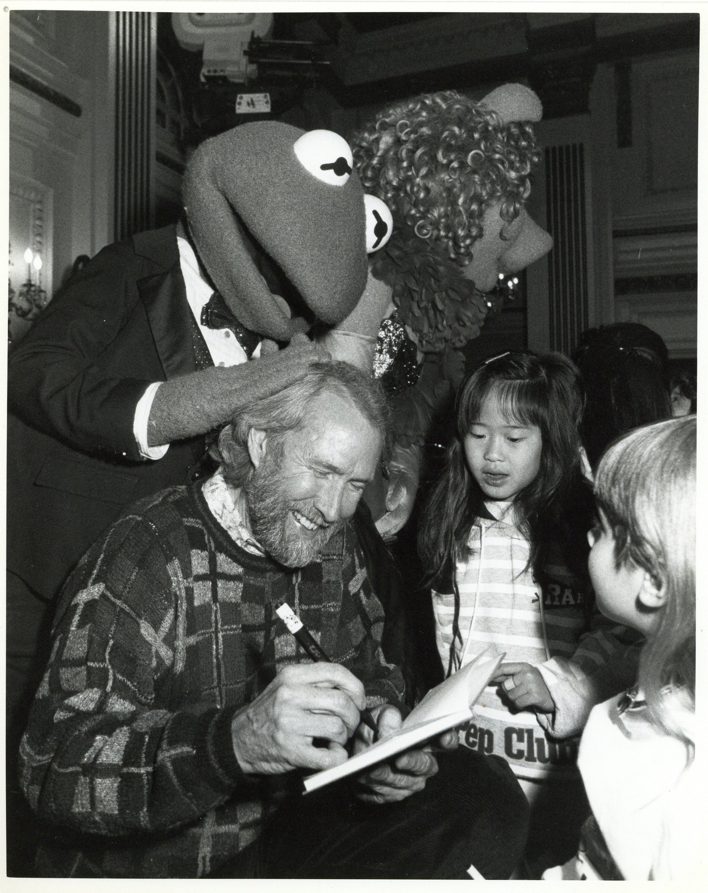 ABOUT THE IMAGE: "BUTTERIN' UP THE BOSS -- Muppets creator Jim Henson gets a little extra attention from Kermit the Frog during an autograph session at the Disney-MGM Studios Theme Park. Kermit, Miss Piggy (seen in the background), and many other Muppet stars make their Disney-MGM Studios debut this summer in a several-times-daily live stage show, "Here Come the Muppets," and as star participants in the daily celebrity cavalcade down the park's Hollywood Boulevard."