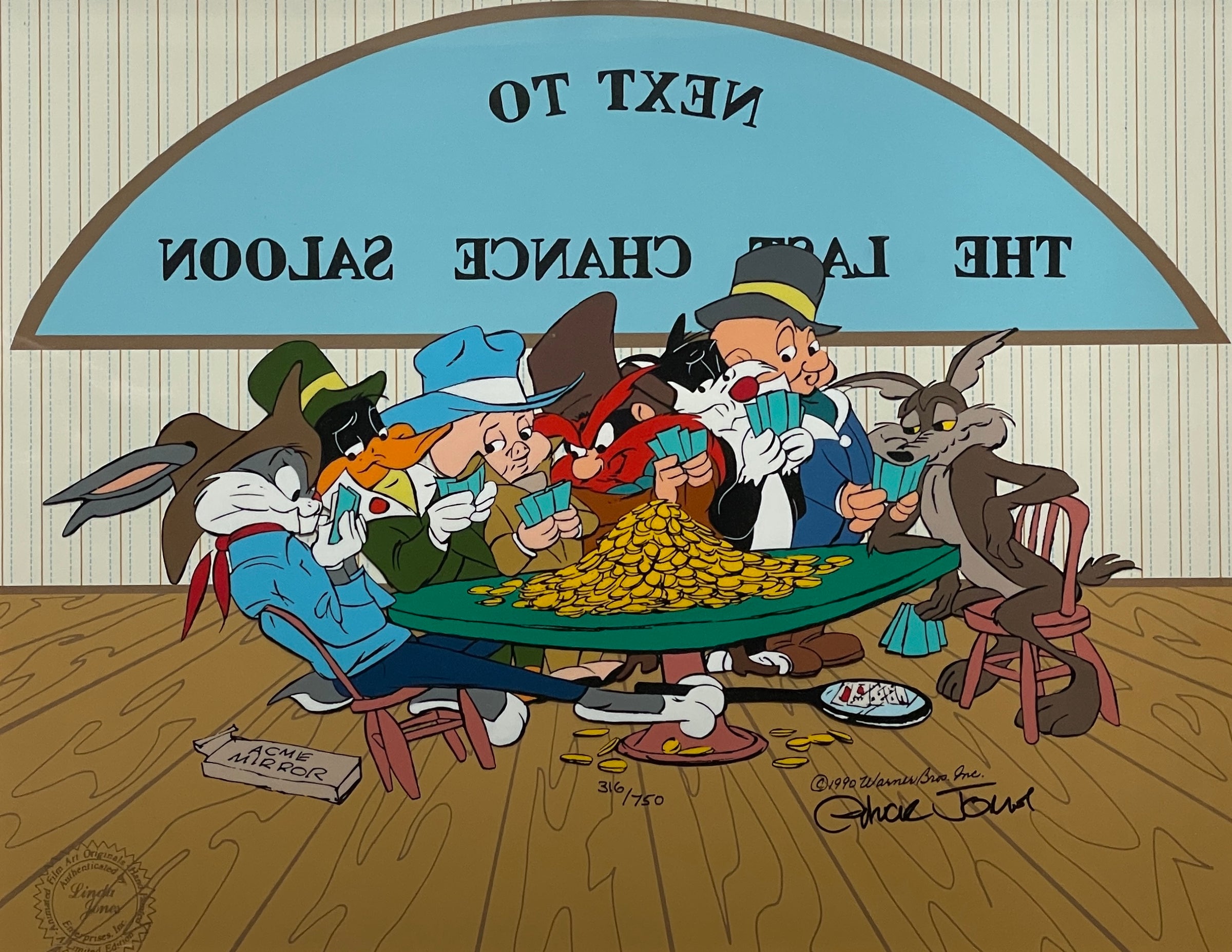 ABOUT THE IMAGE: This Looney Tunes cel features Bugs Bunny, Daffy Duck, Porky Pig, Yosemite Sam, Sylvester, Elmer Fudd and Wile E. Coyote and is hand-signed by Chuck Jones and is numbered 316/750.