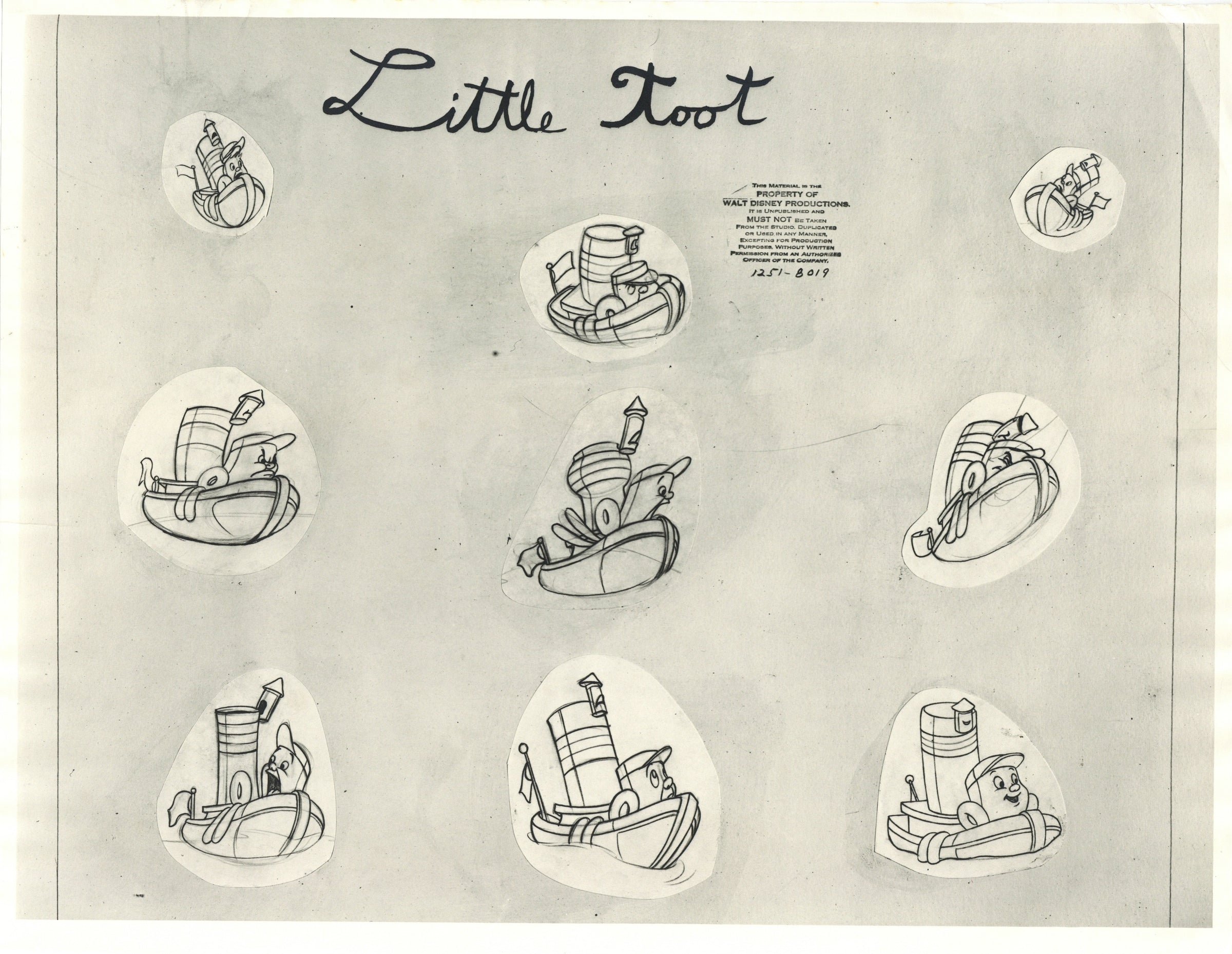 ABOUT THE MEDIUM: Photostat Model Sheets are reference guides used by animators to ensure consistency in character design, proportions, and expressions throughout a film. These printed sheets typically feature multiple poses, facial expressions, and turnarounds of a character, often photocopied from finalized drawings by lead animators. Model sheets help maintain uniformity in animation by providing a standard reference for all artists working on a character, preventing visual discrepancies between different scenes.