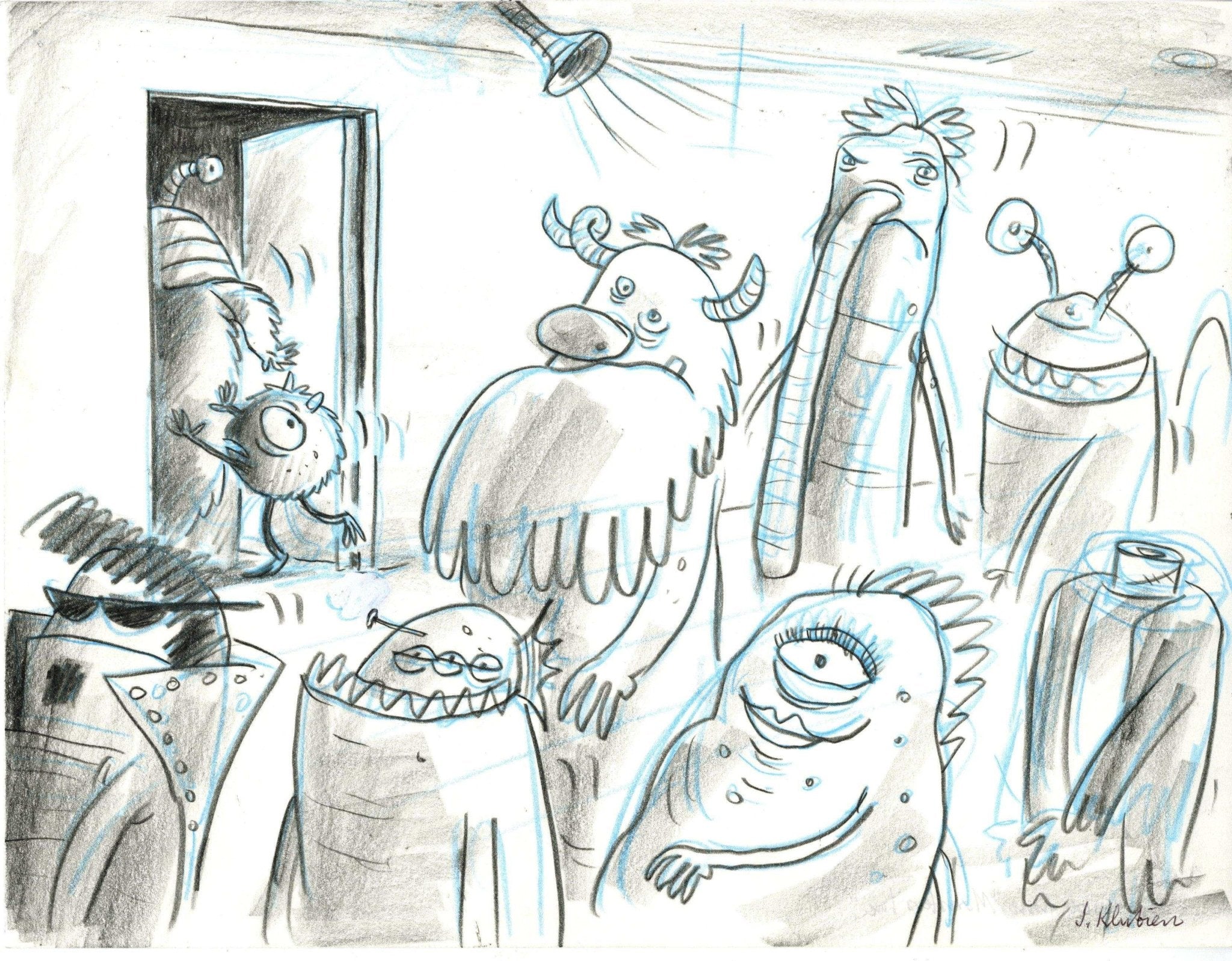 ABOUT THE IMAGE: A fantastic Beat Board from the Pixar production of Monsters Inc. Presented here is a wonderful original storyboard from Disney storyman Jorgen Klubien. Klubien is an animation artist and writer best known for his work on Disney films, like The Lion King (1994), A Bug's Life (1998), Cars (2006) and Frankenweenie (2012). The artwork is rendered with black and blue colored pencil on 8.5" x 11" paper. Signed by the artist, Jorgen Klubien in the bottom right .