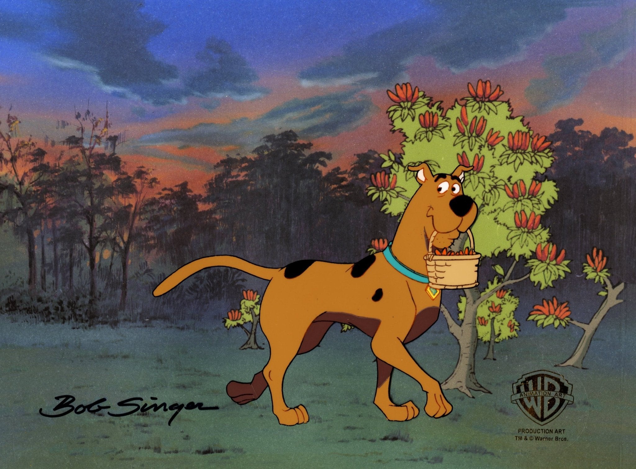 ABOUT THE IMAGE: The Hanna-Barbera cartoon, Scooby-Doo, Where Are You? was launched in 1969 and has had the longest run of a cartoon series. Over the years it’s been in 19 TV series (on CBS, ABC, the WB, Cartoon Network and Boomerang) and more than 40 animated films and two live action movies; one grossed $275 million worldwide. The show featured brainiac Velma, jock Fred, fashionista Daphne, hippie Shaggy, and the talking Great Dane Scooby-Doo, who would pile into their Mystery Machine van and hit the road searching for weird phenomena to solve. This original production cel is hand-signed by key animator Bob Singer and comes with a certificate of authenticity.