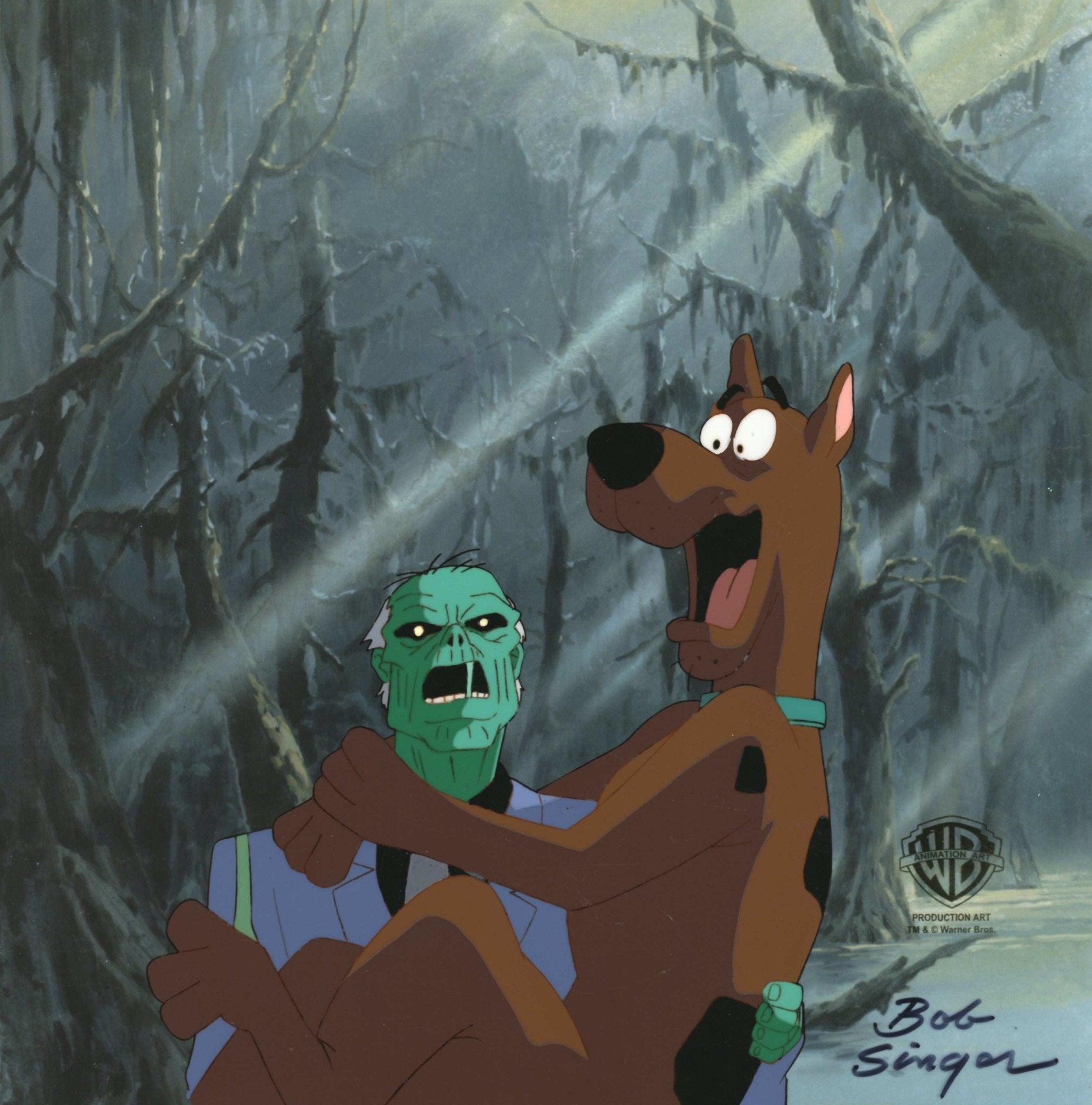 ABOUT THE IMAGE: The Hanna-Barbera cartoon, Scooby-Doo, Where Are You? was launched in 1969 and has had the longest run of a cartoon series. Over the years it’s been in 19 TV series (on CBS, ABC, the WB, Cartoon Network and Boomerang) and more than 40 animated films and two live action movies; one grossed $275 million worldwide. The show featured brainiac Velma, jock Fred, fashionista Daphne, hippie Shaggy, and the talking Great Dane Scooby-Doo, who would pile into their Mystery Machine van and hit the road searching for weird phenomena to solve. This original production cel is hand-signed by key animator Bob Singer and comes with a certificate of authenticity.
