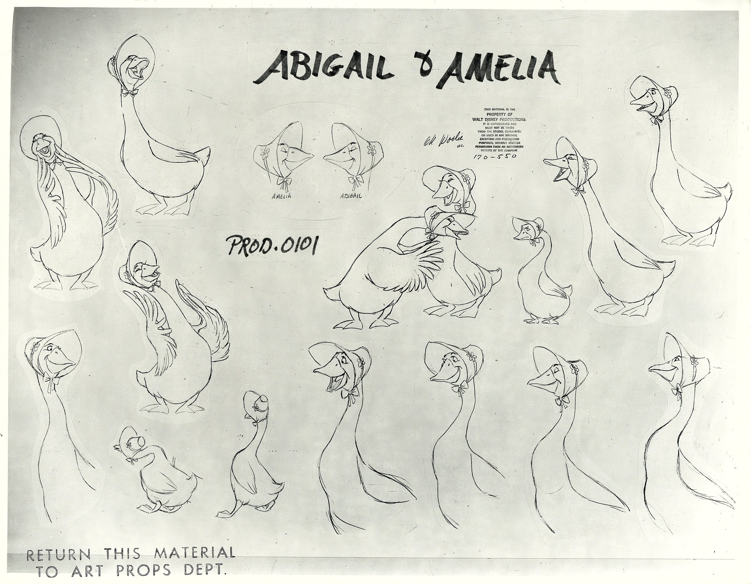 ABOUT THE IMAGE: This photostat model sheet titled "Abigail & Amelia" was made at Disney Studio during production of The Aristocats (1970), and it was issued to animators for their use in drawing the two geese. A stamp reading, "RETURN THIS MATERIAL TO ART PROPS DEPT." has been reproduced in the print.